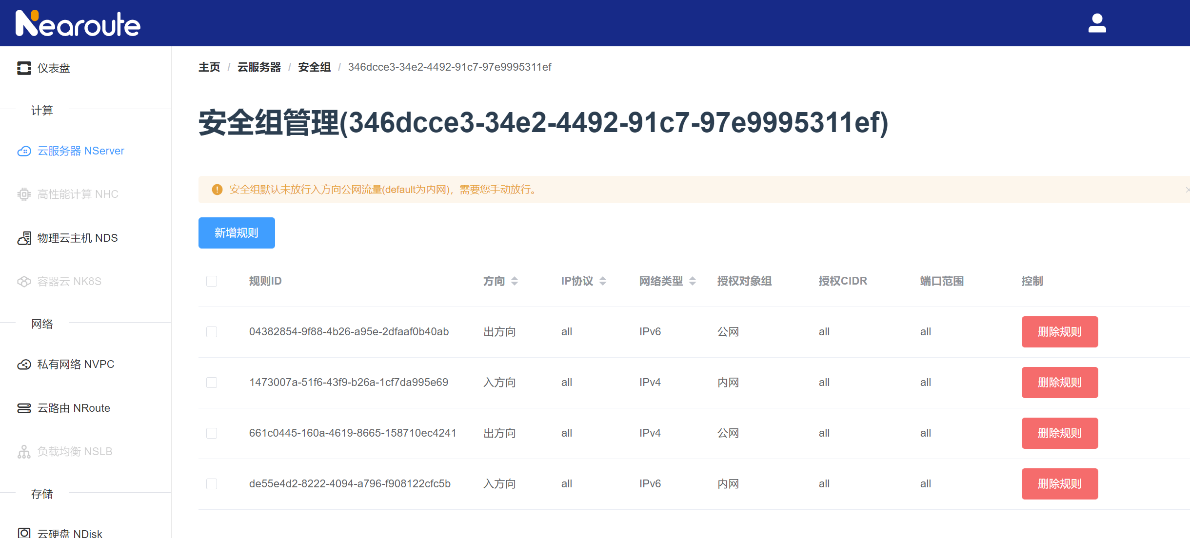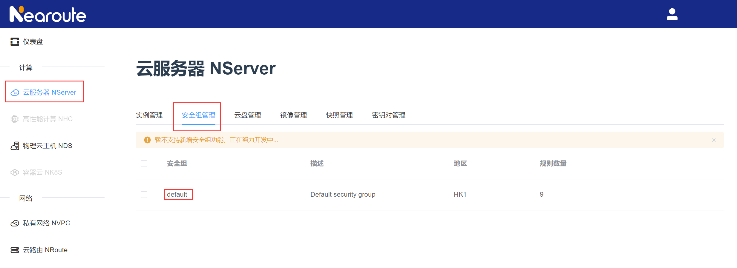 登录nearoute,选择左侧”云服务器NServer”,再选择”安全组管理”,即可查看安全组列表。