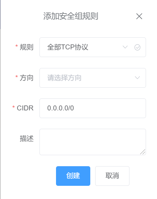 “CIDR”:放行的有关CIDR,如192.168.1.0/24。您可以输入0.0.0.0/0来放行所有IPv4地址。若您需要放行IPv6的流量,则输入IPv6格式CIDR即可,如::/0为放行所有IPv6地址。