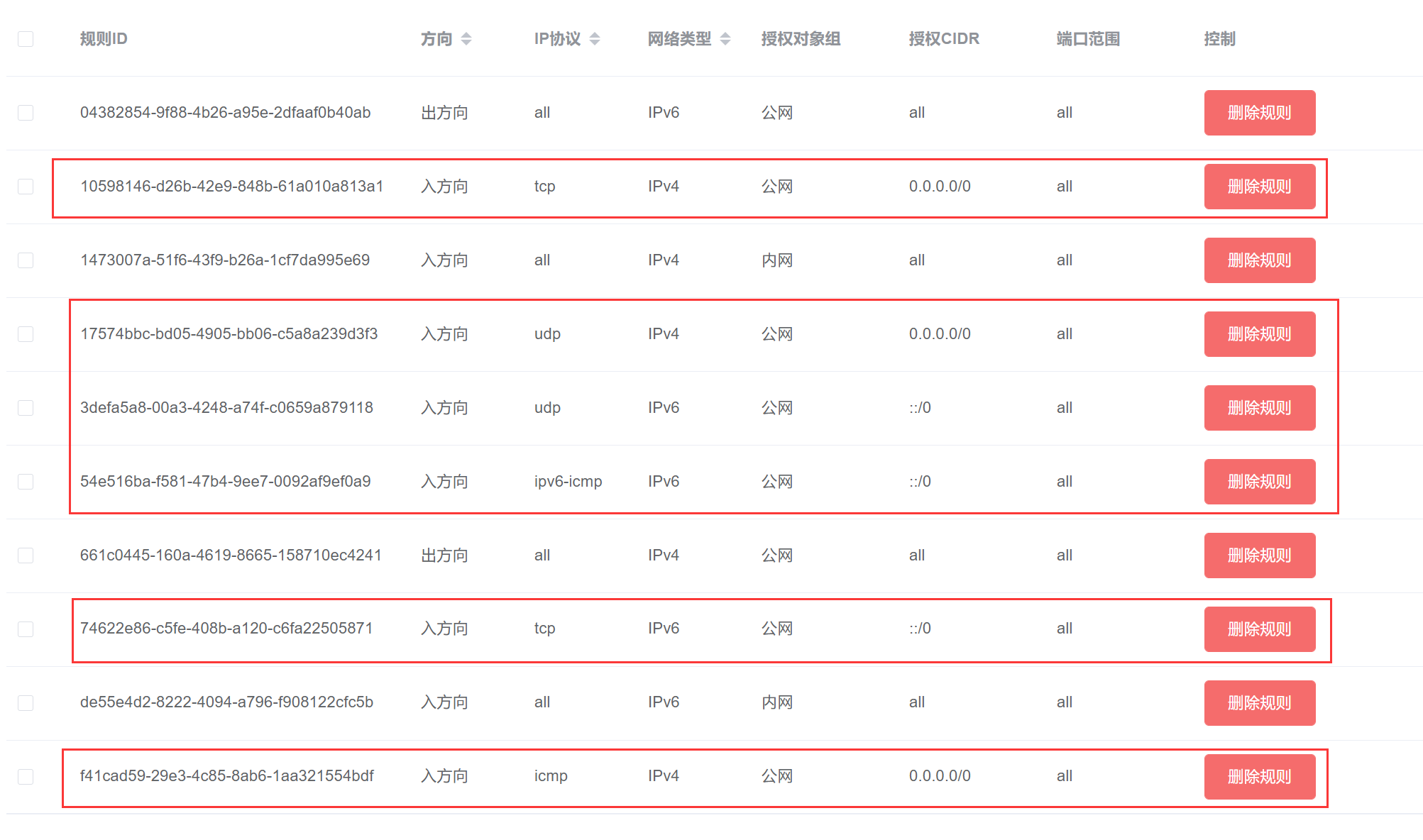 示例如下规则,其中红框内是新增的规则,放行了IPv4+IPv6的所有流入流量。若您不知道该如何设置,可以按照这个规则设置。
